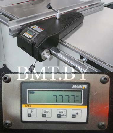 Параллельный упор перемещается по стальной цельной круглой направляющей. Качество обработки и посадки деталей позволяет передвигать упор практически без усилий. Упор имеет механизм точной подстройки, причем размер отображается на электронном дисплее с точностью до 0,1 мм, что практически исключает возможность ошибки при выставлении размера. |