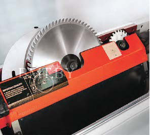 Настройка соосности подрезного пильного диска относительно основной пилы удобно производится через отверстие на рабочем столе. Такая система не требует лишних манипуляций и значительно сокращает время настройки станка. |
